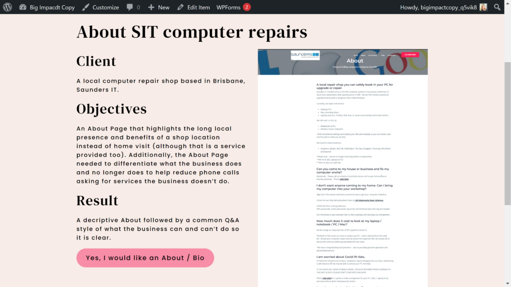 Heartful bigimpactcopy_q5vik8 July 31, 2024 6:28 am No Comments Infobox Title ntranet Site Client A large construction department. Objective The old site was just a list of links (see before pic) – some duplicated – with no pictures or differentiation of the different types of projects documents and thus, the onus was on staff to […]